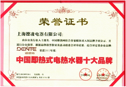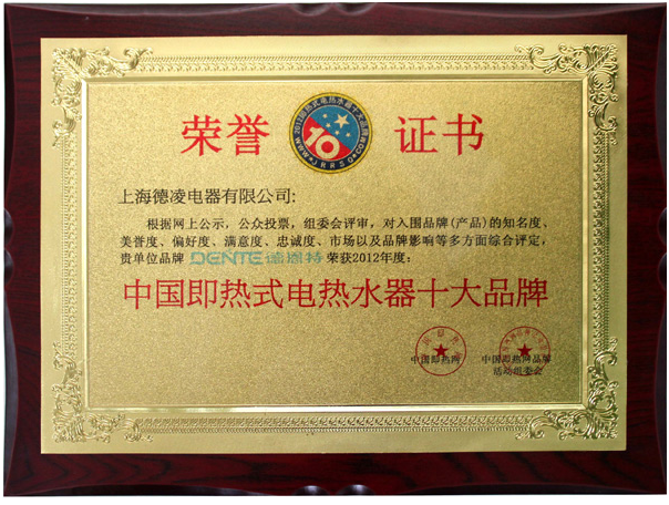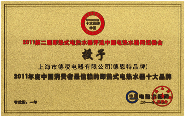 根據(jù)網(wǎng)上公示、公眾投票,組委會(huì)評(píng)審,為入圍品牌(產(chǎn)品)的知名度、美譽(yù)度、偏好度、滿意度、忠誠度、市場(chǎng)以及品牌影響等多方面綜合評(píng)定,上海德凌電器有限公司品牌德恩特榮獲2012年度中國(guó)即熱式電熱水器十大品牌。 【中國(guó)即熱網(wǎng)www.jrrsq.com】